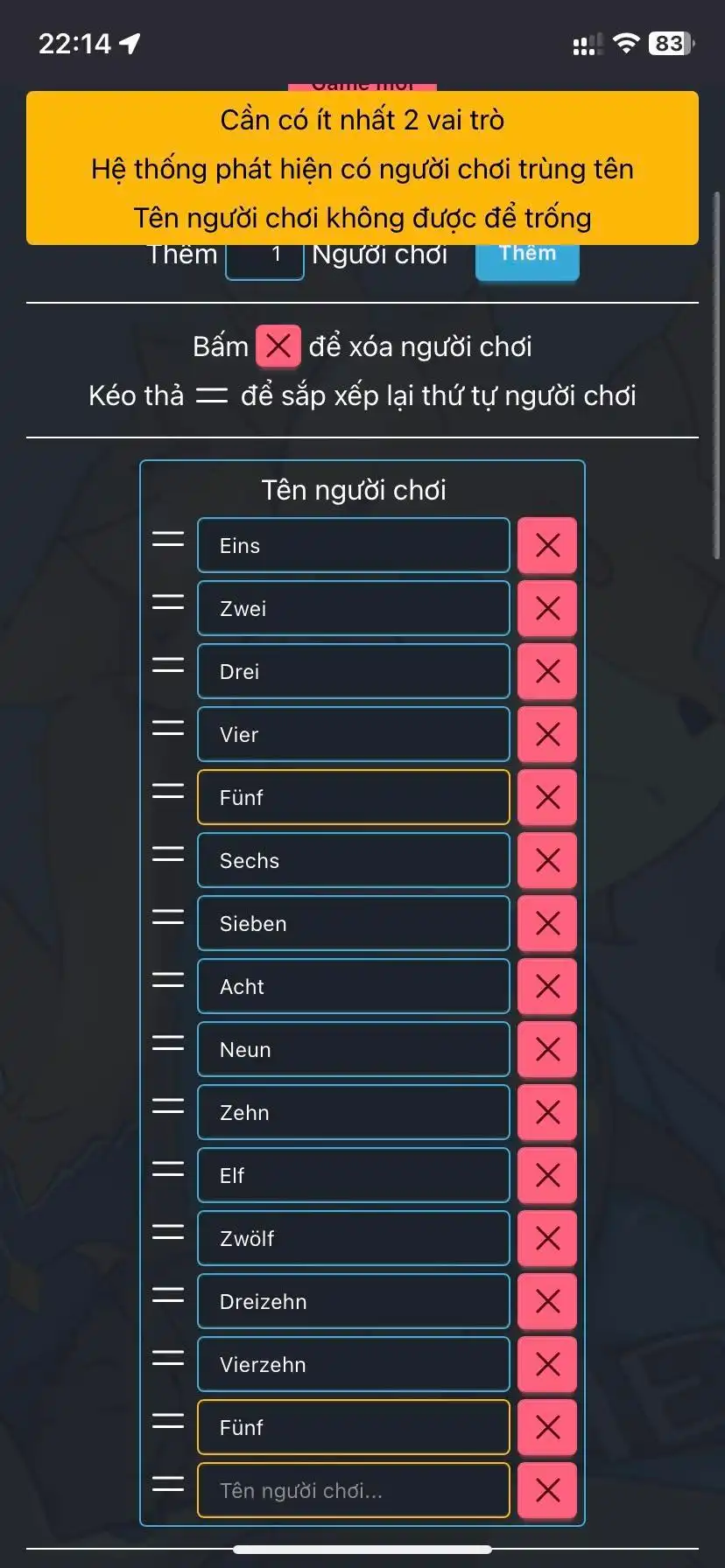Warnings are now stickied to the top, to avoid layout shifting and improve discoverability (previously, you need to scroll down to the start button to see the warnings) - Input fields of duplicate and empty player name are highlighted - Want to see friendly names of friends instead of soulless player IDs? You can now change player names (as well as remove and reorder players, if your friends decided to move around while you're setting up the game)